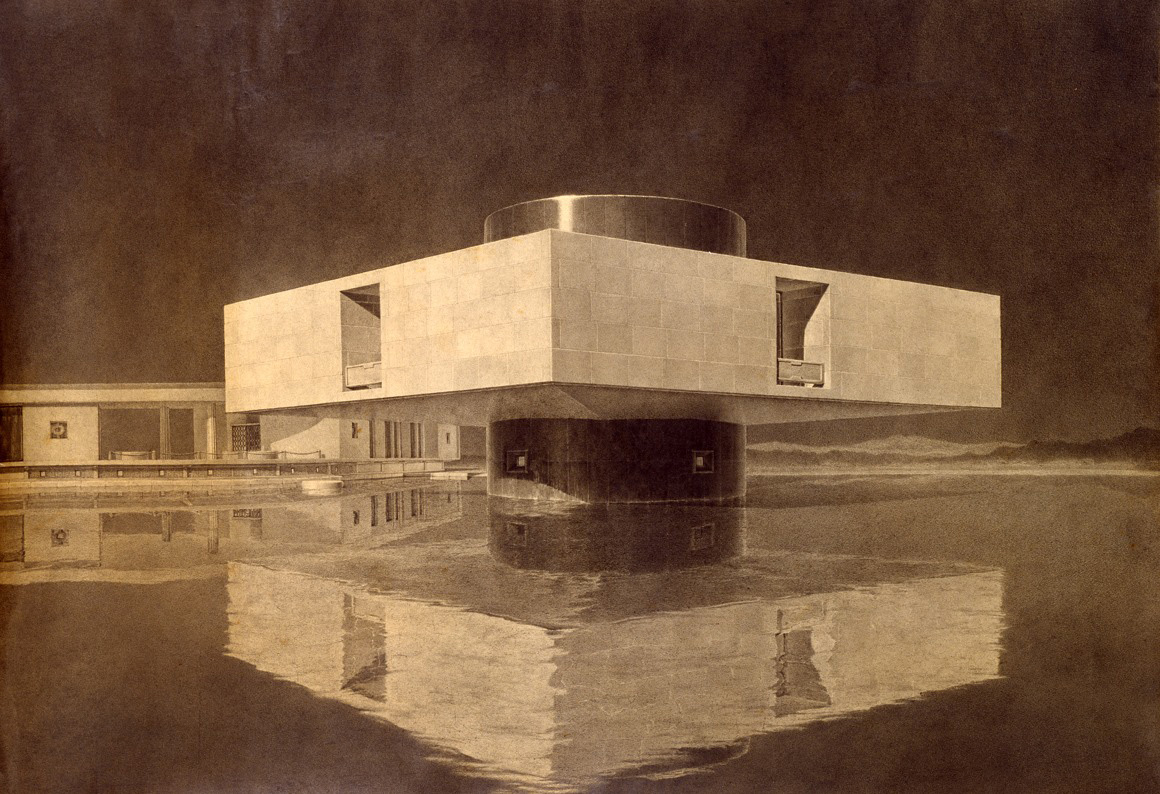 「原爆堂」計画は一枚の精細に描かれたパースと数点の基本図面及び設計者の短いコメントで構成されています。白井の建築家としての活動、エセーを含むさまざまな表現とそれらの背景になった時代に目を向けながら計画の内容と意図を、少しでも全体的かつ正確に把握するための作業を続けています。