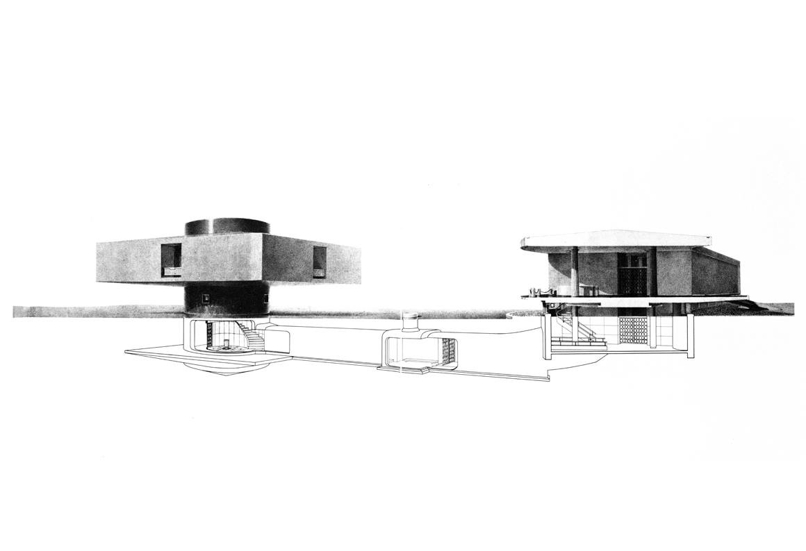 In such circumstances, pieces addressing atomic bombs and the nuclear issue began to be created afresh in various areas, such as movies, literature, comics, photos, art, and music. Well-known movies include “Godzilla” by Ishiro Honda, “I Live in Fear” by Akira Kurosawa, “Lucky Dragon No. 5” by Kaneto Shindo, and “Hiroshima mon amour” by Alain Resnais. The only architectural expression confronting the nuclear issue was “Genbakudo” plan, which was published in newspapers in April 1955 as a proposal for the Maruki Gallery for the Hiroshima Panels. “Genbakudo” came to public attention, yet was never constructed. In August, Shirai made a brochure in English for an international society, and he expanded its function to something other than a museum.